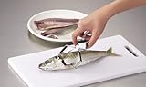 ●小魚を簡単に三枚におろせる 魚の3枚おろし専用ピーラー。 使用方法:1.魚の胸ひれをおこし、その下に刃をあてて中骨にあたるまで切れ込みをいれます。2.魚の頭をしっかり押さえてピーラーを中骨に沿わせるようにして尾の方向に引ききります。3.刃を細かく横に動かしながら引いていくと滑らかに切れます。4.半身を切り終わったら魚を裏返して同様に作業します。 食器洗い乾燥機対応。 材質:ステンレススチール